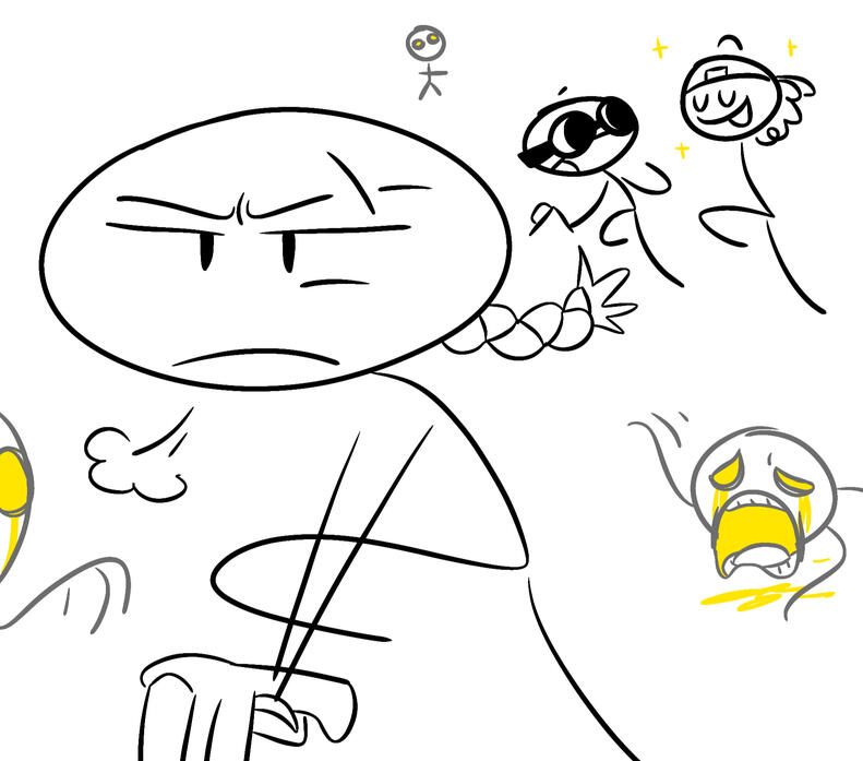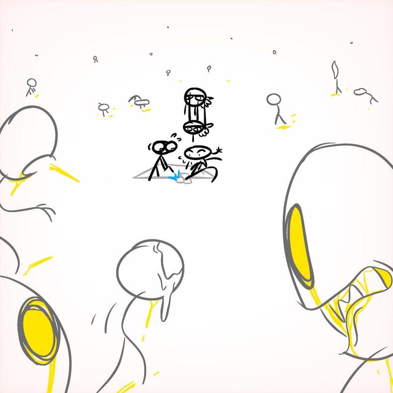 you and Jumpy spray them back, but they keep closing in. before their rotting skin can touch you, someone starts sweeping their legs, cackling goofily as they do.